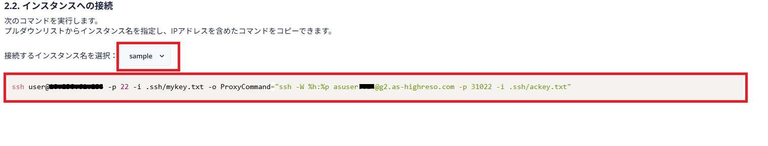 [接続するインスタンス名を選択]のプルダウンメニューから実際に接続するインスタンス名を選択すると、インスタンスIPアドレスが入りのSSHコマンドが生成されますので、これをコピーします。