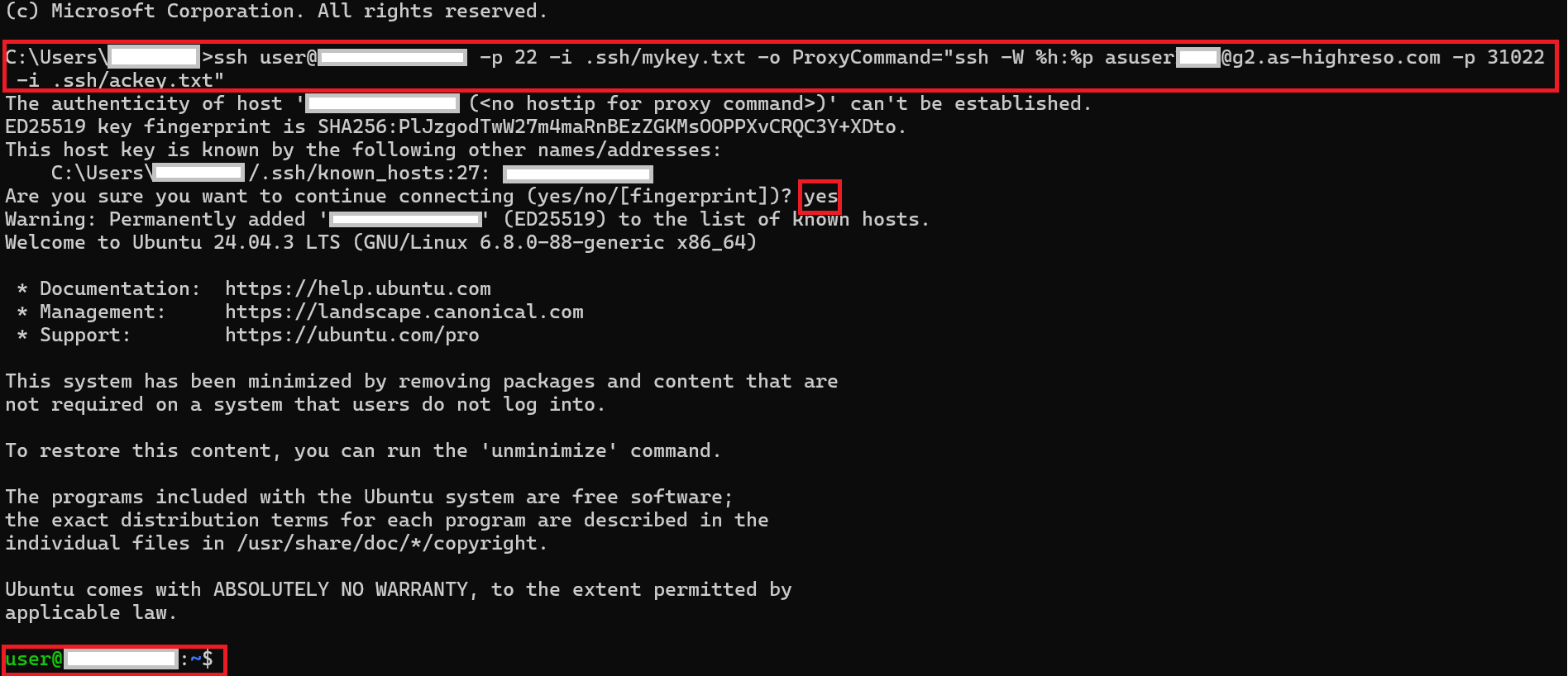コマンド実行後にSSH接続するか否かの確認["Are you sure you want to continue connecting(yes/no)"] が表示されますので"yes"と入力後Enterキーを押下します。