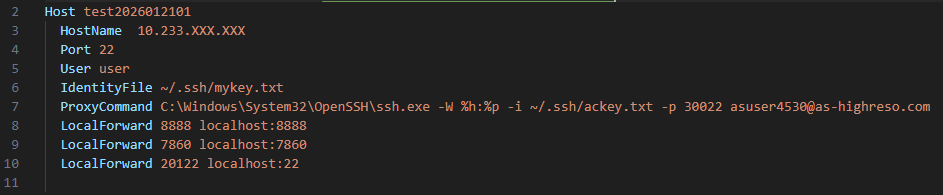 ※[LocalForward 8888 localhost:8888]は、Jupyter Labを使用する場合に記述します