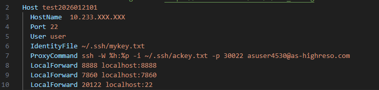 ※[LocalForward 8888 localhost:8888]は、Jupyter Labを使用する場合に記述します。