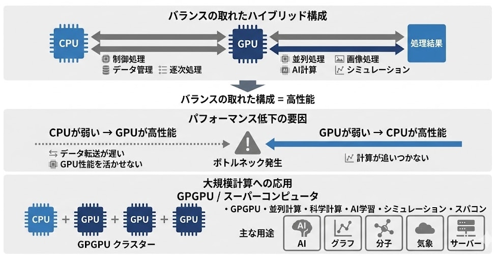 現代のコンピューターシステムにおいて、CPUとGPUを適切に組み合わせるハイブリッドアプローチは、全体の処理効率を劇的に向上させる鍵となります。