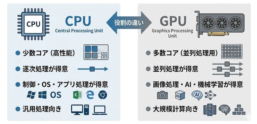具体的な用途 | ・ウェブブラウジング・文書作成 ・システム管理・一般的なアプリ実行 | ・ゲーム描画・動画編集・3DCG制作 ・AI学習・推論・暗号通貨マイニング |