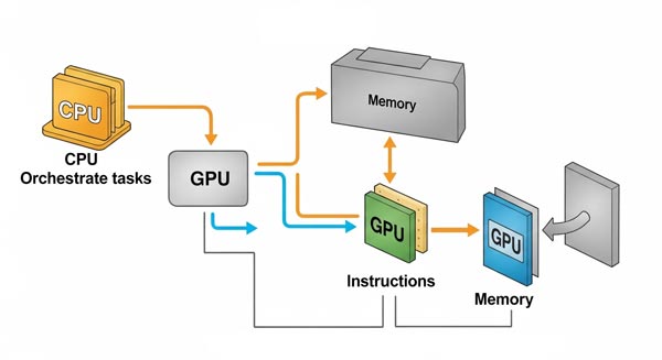 CPUの構造には、数個〜数十個程度の高性能なコアが搭載されています。1つ1つのコアの処理能力が高く、複雑な計算や高度な判断を正確に行えるのが特徴です。そのためCPUは、コンピュータ全体の処理を管理する「指揮官」や「司令塔」のような役割を担っています。GPUなどの他のプロセッサに対して、「この計算を実行してほしい」と指示を出すのもCPUの重要な役割です。