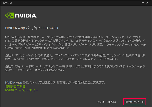 公式HPから「GeForce Experience」をPCにダウンロードします。